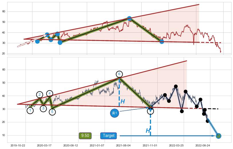 ➣ 扩散三角反转:猜想预期下跌目标target即将达成,随后猜想强支撑来临,预期反弹上涨(均值回复)
