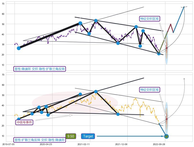 ➣ 双针探底 + 扩散三角反转临近target支撑拐点上涨信号叠加后【目标达成率】中等,【看多】信号叠加【存续影响中等】