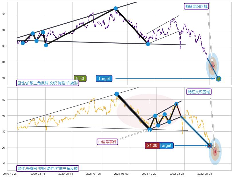 ➢ 扩散三角反转:猜想下跌target达成后 → 上涨 → 机会信号 → 大趋势均值回复