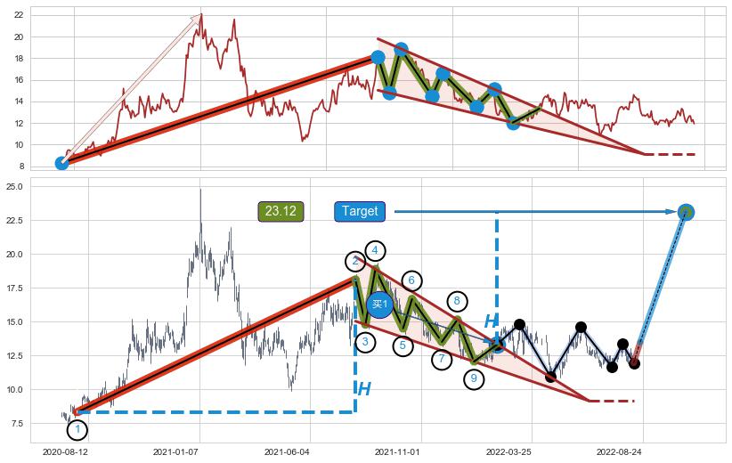 ➢ 【买1】: 激进型 买点 →(2022-02-10: 13.32 )形成突破降🚩楔型【整理】形态