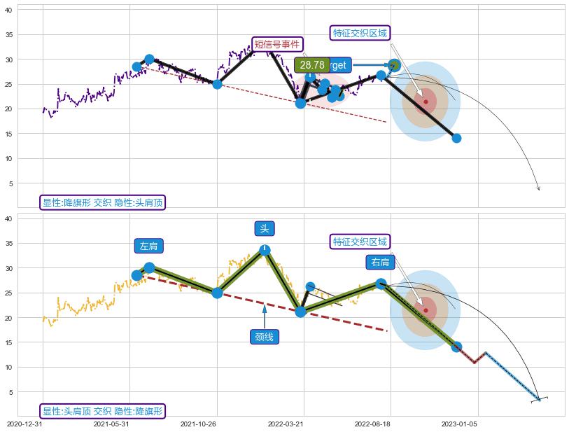 ➣ 看跌(高位倒锤头)流星线 + 降旗形临近target阻力拐点下跌信号叠加后【目标达成率】中等,【看空】信号叠加【存续影响中等】