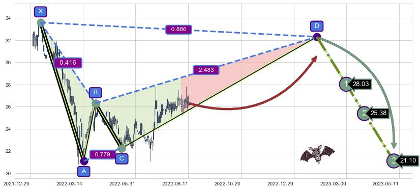 ➢ 距离预测D点位置尚有上涨空间,短线依然【看涨】, 耐心等待看跌【蝙蝠】形态反转启动