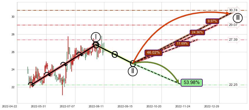 ➣ D点拟合预测价格32.31,距离最后交易收盘价格26.30相差 +22.84%
