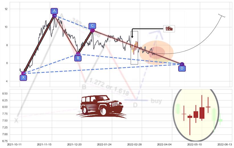 ➢ 谐波伽利:c下跌临近d:猜想拉升 → 上涨 →【拐点】强支撑临近 → 大趋势均值回复