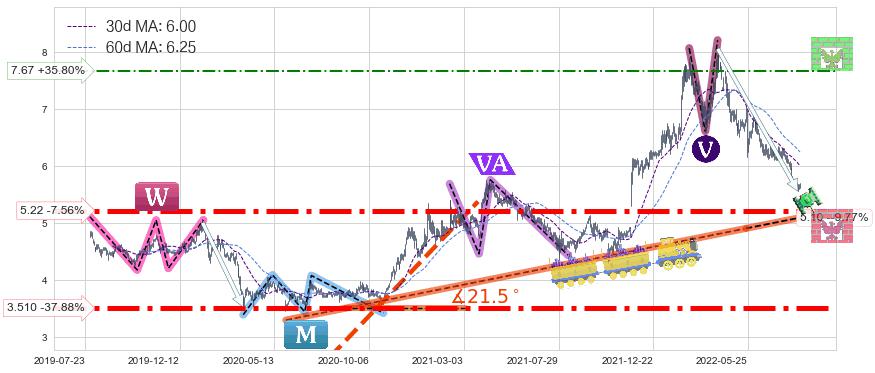 ♘ 支撑价格位5.22,可信任强度92.97%,距离最后交易2022-08-12形成的收盘价格5.65相差 -7.56%