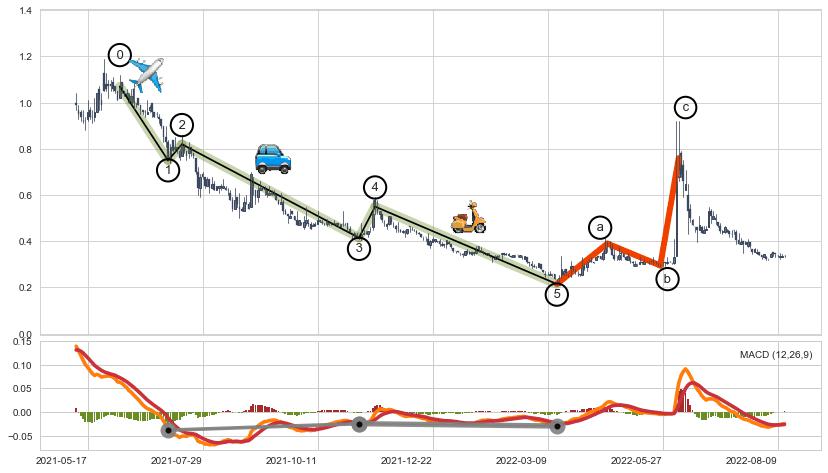 ➢ 波浪理论:猜想达到c点后小反弹终止反转下跌 → 下跌 → 【拐点】临近 → 阶段均值回复结束后继续大周期趋势跟踪