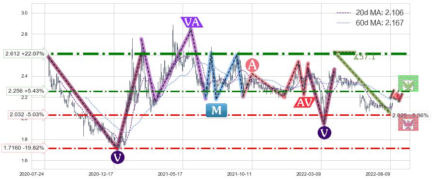 ♘ 阻力价格位2.256,可信任强度67.50%,距离最后交易2022-08-12形成的收盘价格2.140相差 +5.43%