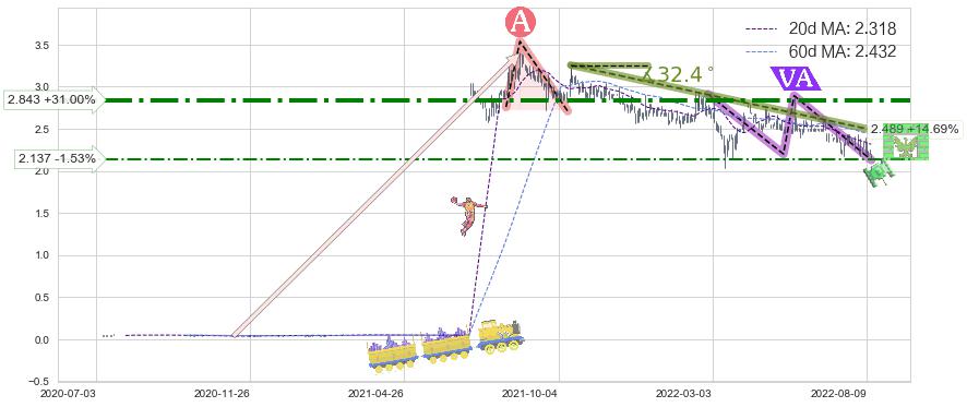 ♘ 阻力价格位2.843,可信任强度81.65%,距离最后交易2022-08-12形成的收盘价格2.170相差 +31.00%