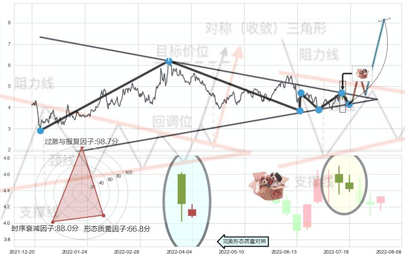 ➣ AI智能: 预测【多空区域上下窄幅震动→价格波动日益狭窄→多方占优】对称三角形中继整理向上突破,预测将在2022-08-03突破颈线, 演变成上升通道