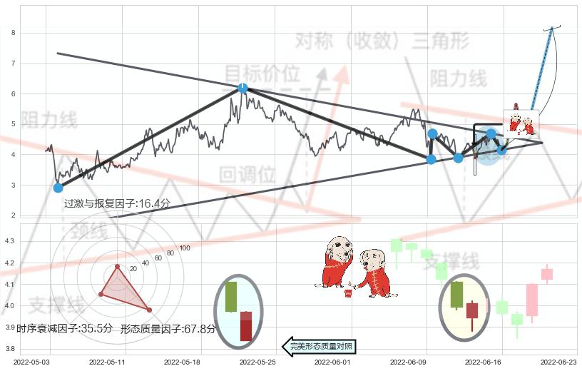 ➣ 早晨之星(黎明之星) + 上升对称三角整理临近阻力猜想转换支撑上涨信号叠加后【目标达成率】中等,【看多】信号叠加【存续影响中等】
