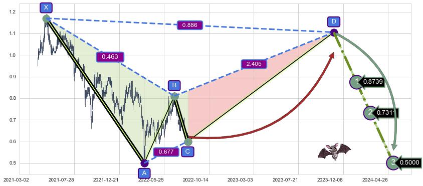 ➣ 谐波蝙蝠:b下跌接近c:猜想支撑性拉升 → 上涨 →【拐点】支撑临近 → 大趋势均值回复