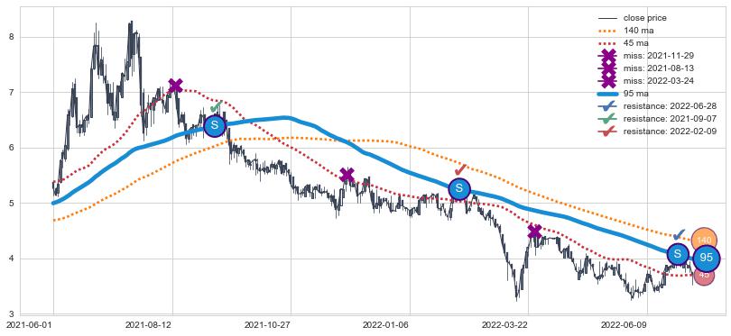 ➣ 21小时均线于(2022-07-06: 3.734)形成【死叉】基于【死叉历史模型】预测死叉后最低波谷价格: 3.363, 死叉后最低价格3.360,虽然已经到达预测最低波谷价格,但耗时间很短动能很强, 预期继续下跌