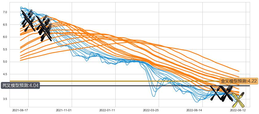 ➣ 120小时均线于(2021-09-14: 6.22)形成【死叉】基于【死叉历史模型】预测死叉后最低波谷价格: 5.00, 死叉后最低价格3.290,已经下跌超出预测最低波谷价格, 预期反弹