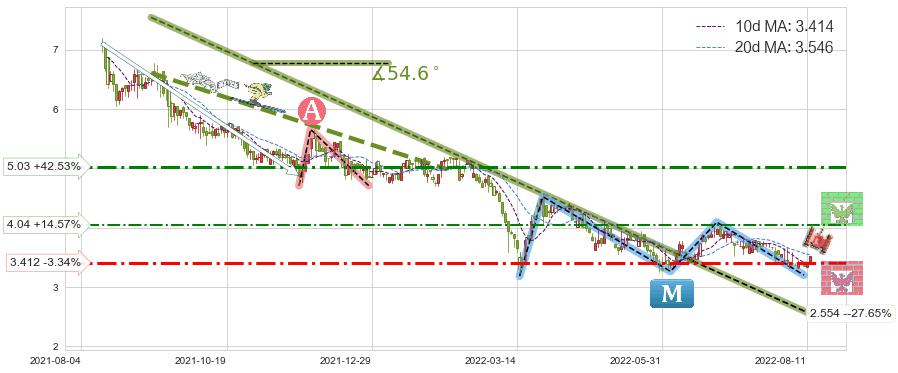 ♘ 支撑价格位3.412,可信任强度64.57%,距离最后交易2022-08-12形成的收盘价格3.530相差 -3.34%