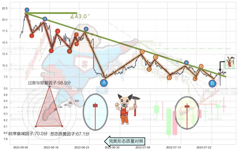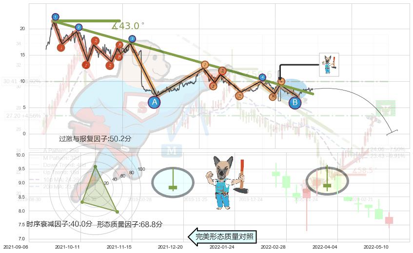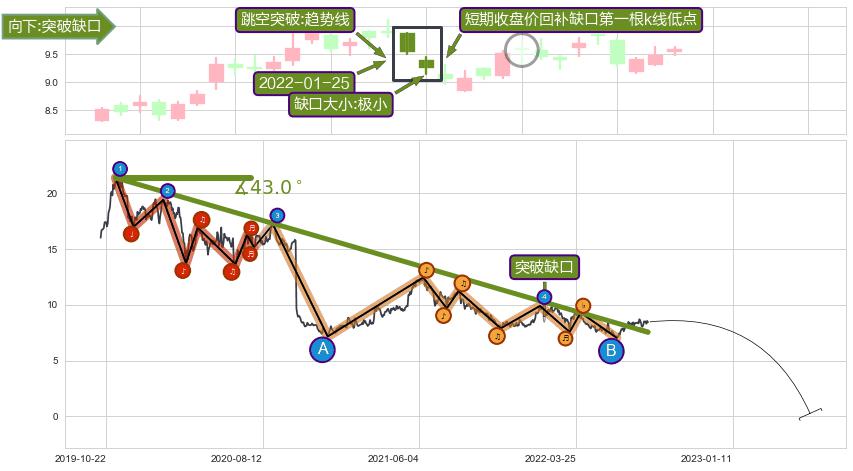 从2019-11-07至2022-07-27,共包含669个交易日,阶段股价下跌-60.74%,阶段股价变动位移路程比: 1 : 21,下跌趋势角度: 43.0,2020-10-15向↘︎形成缺口,跳空下跌-38.52%˚