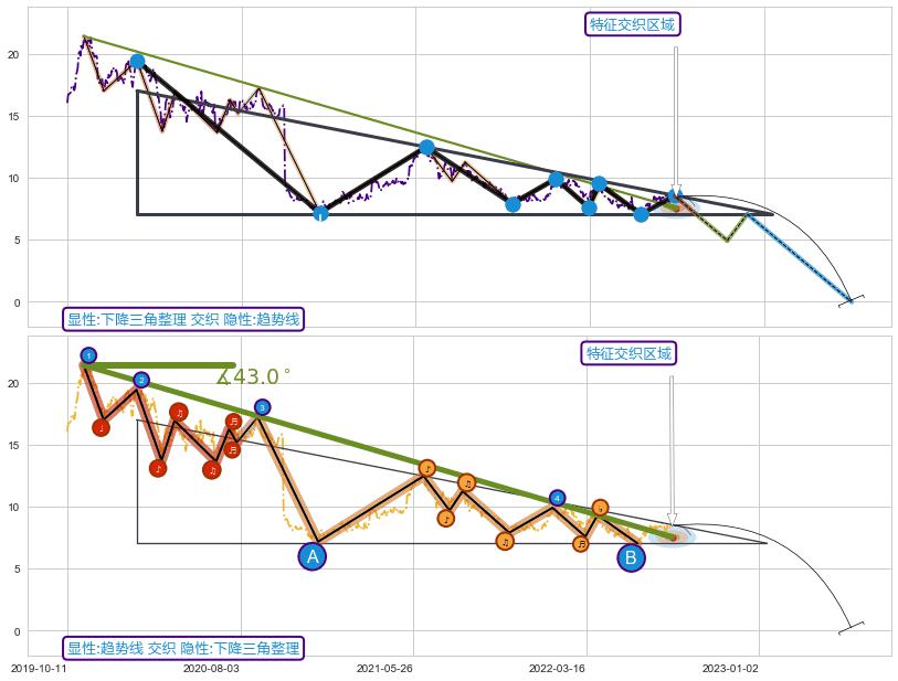 ➢ 下降三角整理:猜想临近关键支撑位突破点 → 临近拐点下跌 → 风险信号 → 大趋势均值回复