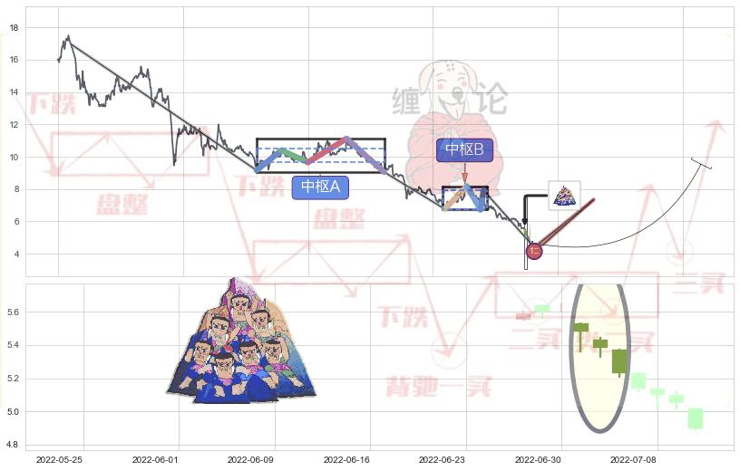 ➣ 【中枢B】:2021-12-20-2022-03-22,中枢由4笔构成,共63交易日, ZG=7.92, ZD=6.77