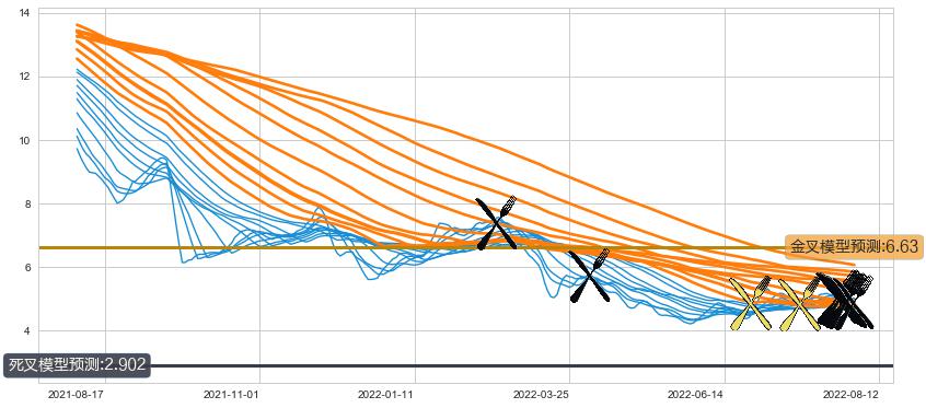➣ 40小时均线于(2022-08-08: 4.91)形成【死叉】基于【死叉历史模型】预测死叉后最低波谷价格: 3.115, 死叉后最低价格4.72,尚未达到预测最低波谷价格, 预期继续下跌