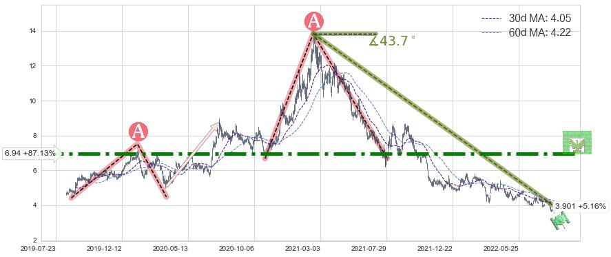 ♘ 阻力价格位6.94,可信任强度89.83%,距离最后交易2022-08-12形成的收盘价格3.710相差 +87.13%