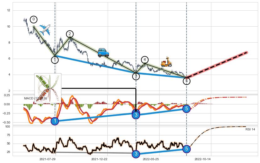 ➣ 第一, 三, 五浪下跌动能逐渐【衰弱变小】,趋势呈现不稳迹象