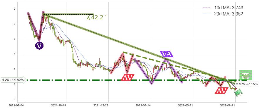 🦴 长线均值回复组合短线趋势跟踪[强阻力信号]2021-09-06-2022-08-12下跌趋势依然成立(下跌趋势跟踪依然存在),短线价格略微上行反弹(均值回复猜想),即将接近下跌趋势提供的未破位阻力价格:3.975。