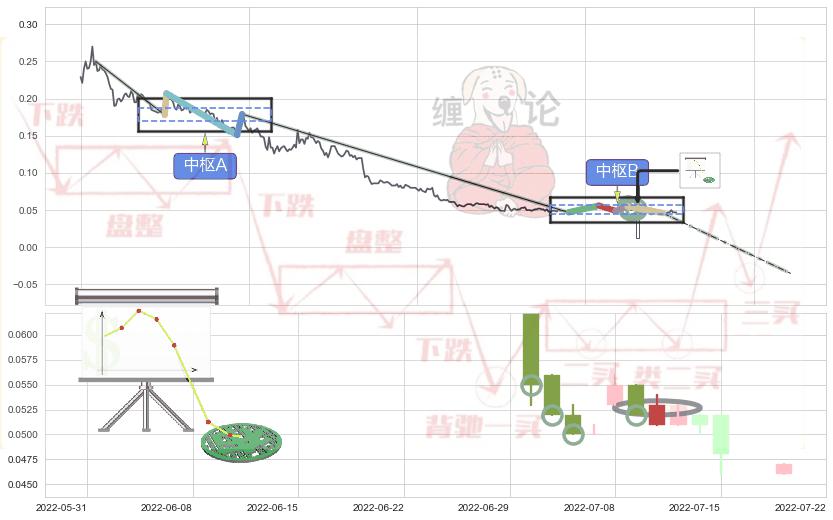 ➣ 【中枢B】:2022-05-11-2022-08-02,中枢由5笔构成,共57交易日, ZG=0.0550000, ZD=0.0490000