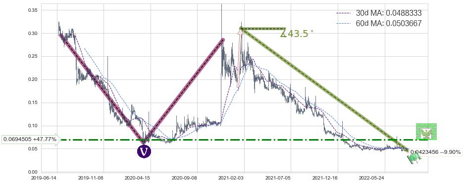 ♘ 阻力价格位0.0694505,可信任强度66.23%,距离最后交易2022-08-12形成的收盘价格0.0470000相差 +47.77%