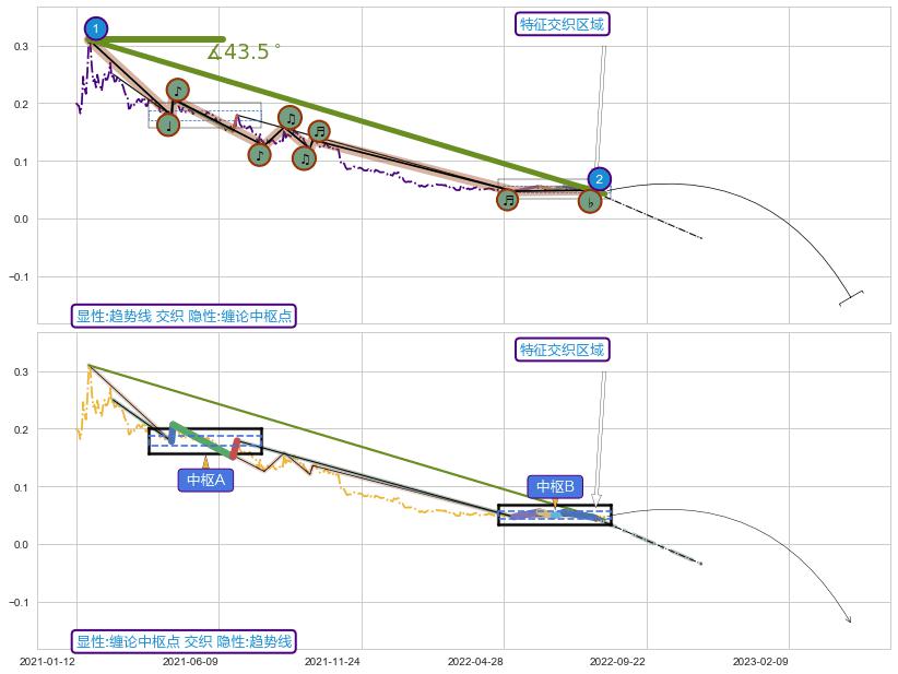 ➣ 缠论中枢点:猜想破位中枢B后持续下拉 → 下跌 → 破位中枢B支撑 → 持续趋势跟踪