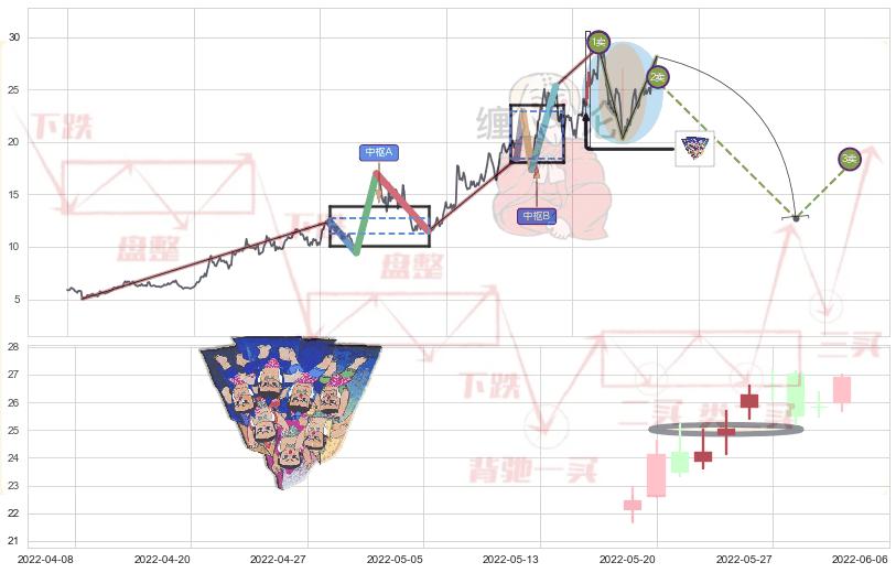 ➣ 【中枢B】:2022-02-25-2022-04-13,中枢由4笔构成,共32交易日, ZG=22.90, ZD=18.40
