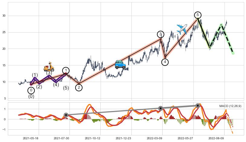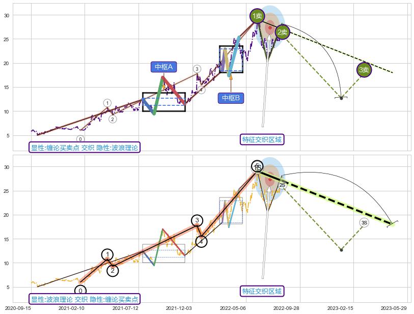 ➣ 缠论买卖点:猜想2卖持续蓄力下跌至3卖 → 下跌 → 风险信号 → 小趋势跟踪