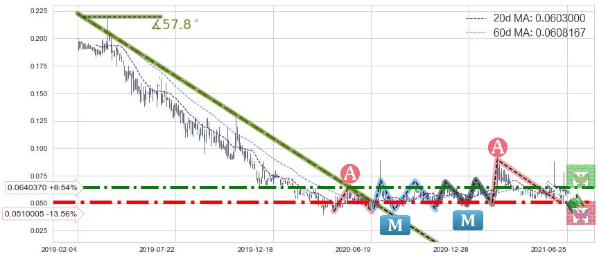 ♘ 支撑价格位0.0510005,可信任强度97.17%,距离最后交易2021-06-30形成的收盘价格0.0590000相差 -13.56%