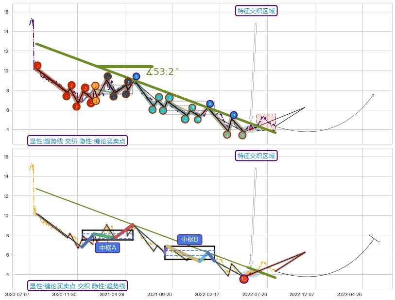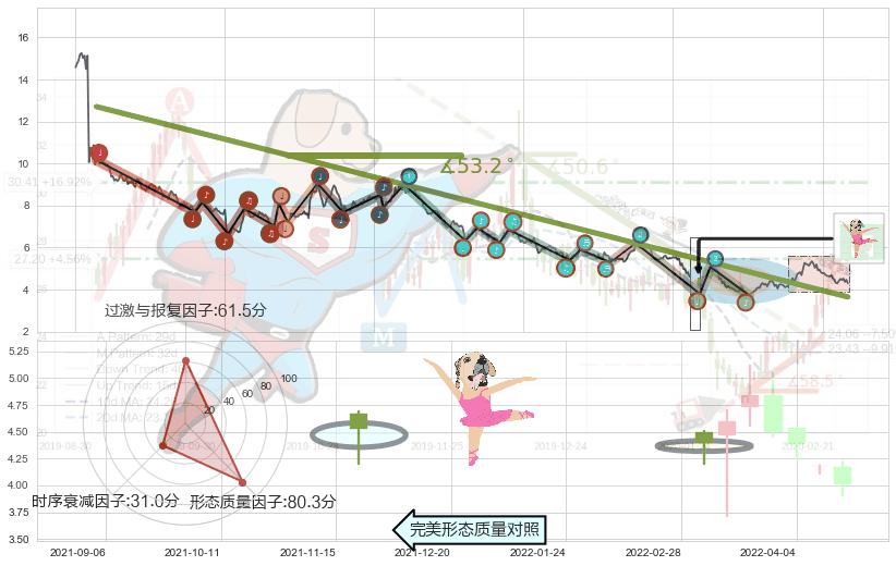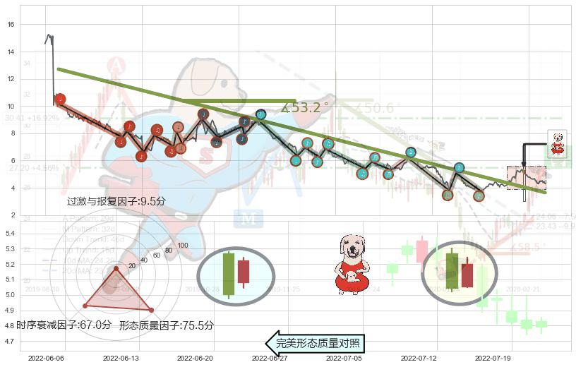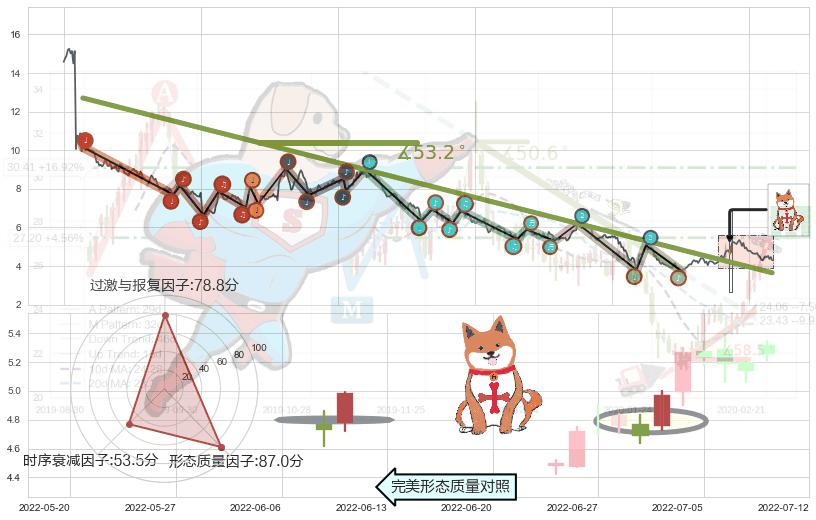 从2020-07-27至2022-05-20,共包含446个交易日,阶段股价下跌-74.25%,阶段股价变动位移路程比: 1 : 10,下跌趋势角度: 53.2
