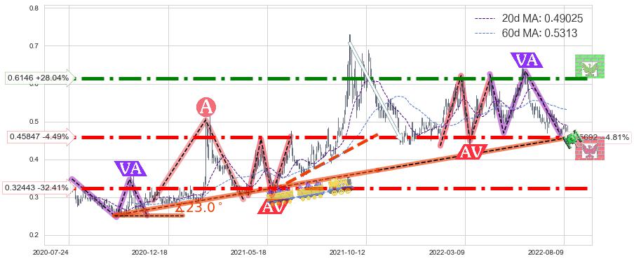 ➢ 【仅预测突破】最后价格:0.48000与预测突破价格:0.46500→【空间中等】后续最小【整理】第一目标价格→(2022-09-08: 0.39667 )