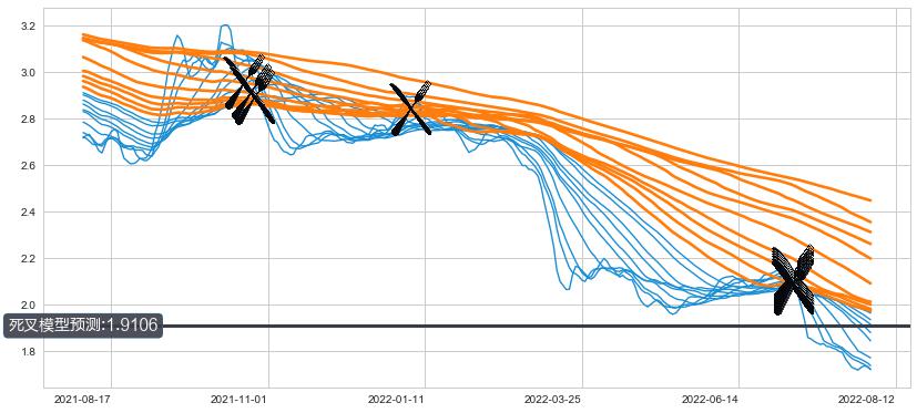 ➣ 34小时均线于(2022-07-08: 2.104)形成【死叉】基于【死叉历史模型】预测死叉后最低波谷价格: 1.8148, 死叉后最低价格1.6800,已经下跌超出预测最低波谷价格, 预期反弹