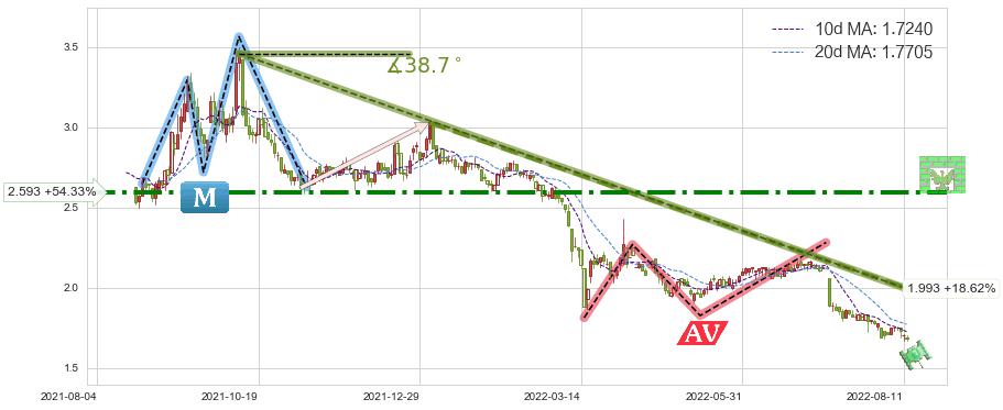 ♘ 在最后的下跌阶段2021-10-07至2022-08-12,存在 持续未破位的阻力位 ,阻力价格1.993,可信任强度82.45%,其距离最后价格1.6800相差 +18.62%