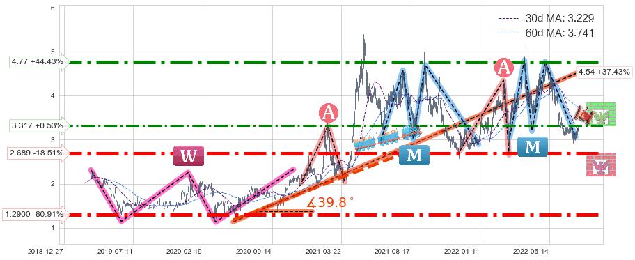 ♘ 阻力价格位3.317,可信任强度66.56%,距离最后交易2022-08-12形成的收盘价格3.300相差 +0.53%