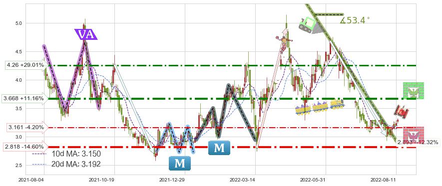 ♘ 阻力价格位3.668,可信任强度71.84%,距离最后交易2022-08-12形成的收盘价格3.300相差 +11.16%