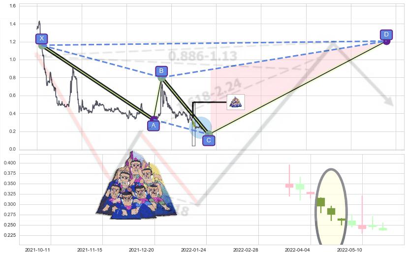 ➣ 双针探底 + 谐波鲨鱼下沉击穿c上涨拐点信号叠加后【信号初始稳固度】极低,【看多】信号叠加【可信度影响极小】