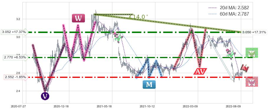 ♘ 阻力价格位2.770,可信任强度81.72%,距离最后交易2022-08-12形成的收盘价格2.600相差 +6.53%