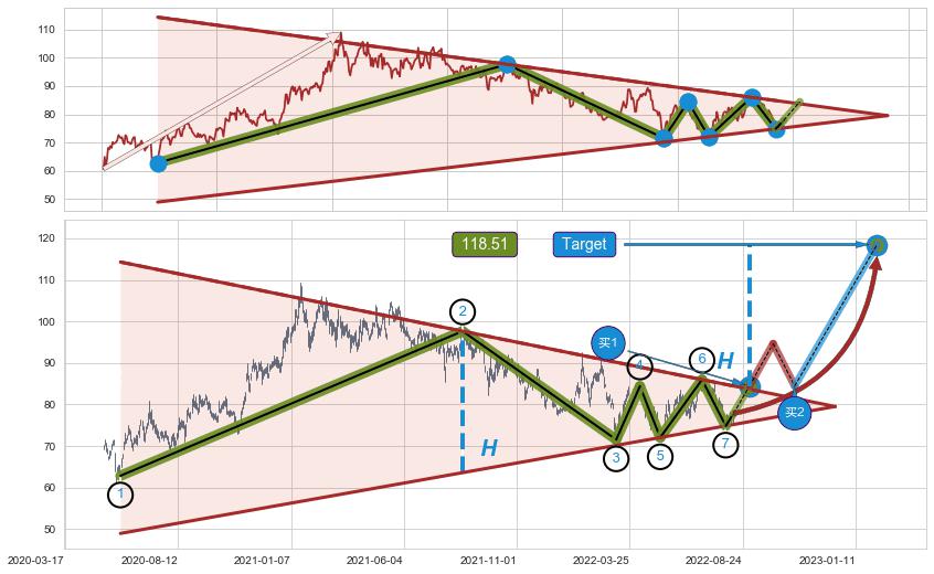 ➢ 最小中继整理涨幅→𝐇: 34.05 (高点逐步降低斜边第一阻力点②与支撑边垂直距离)