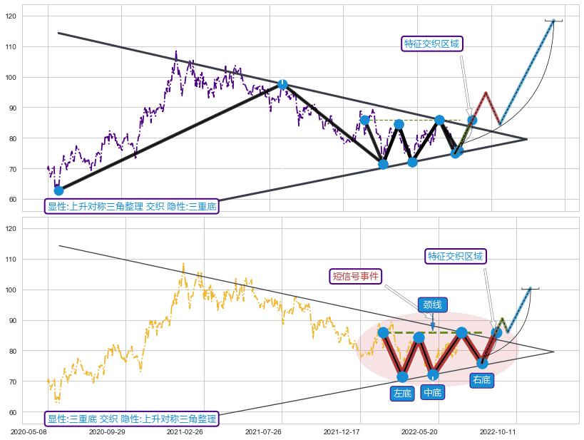 ➢ 上升对称三角整理:猜想临近关键阻力位突破点 → 临近拐点上涨 → 机会信号 → 大趋势均值回复