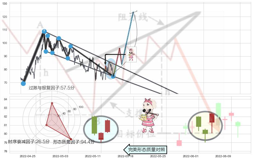 ➣ 曙光初现形态 + 降楔型临近阻力猜想转换支撑上涨信号叠加后【目标达成率】中等,【看多】信号叠加【存续影响中等】