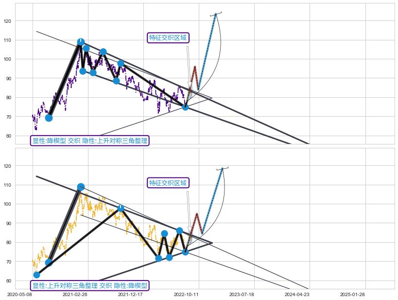 ➣ 上升对称三角整理:猜想临近关键阻力位突破点 → 临近拐点上涨 → 机会信号 → 大趋势均值回复