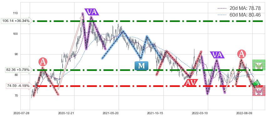 ♘ 支撑价格位74.59,可信任强度95.62%,距离最后交易2022-08-12形成的收盘价格77.85相差 -4.19%