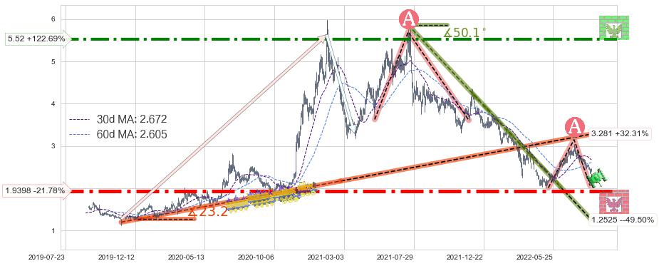 ♘ 支撑价格位1.9398,可信任强度92.56%,距离最后交易2022-08-12形成的收盘价格2.480相差 -21.78%