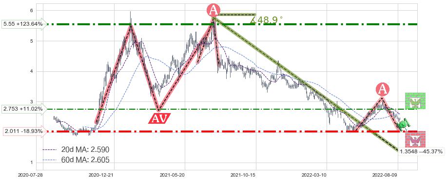 ♘ 阻力价格位2.753,可信任强度47.34%,距离最后交易2022-08-12形成的收盘价格2.480相差 +11.02%