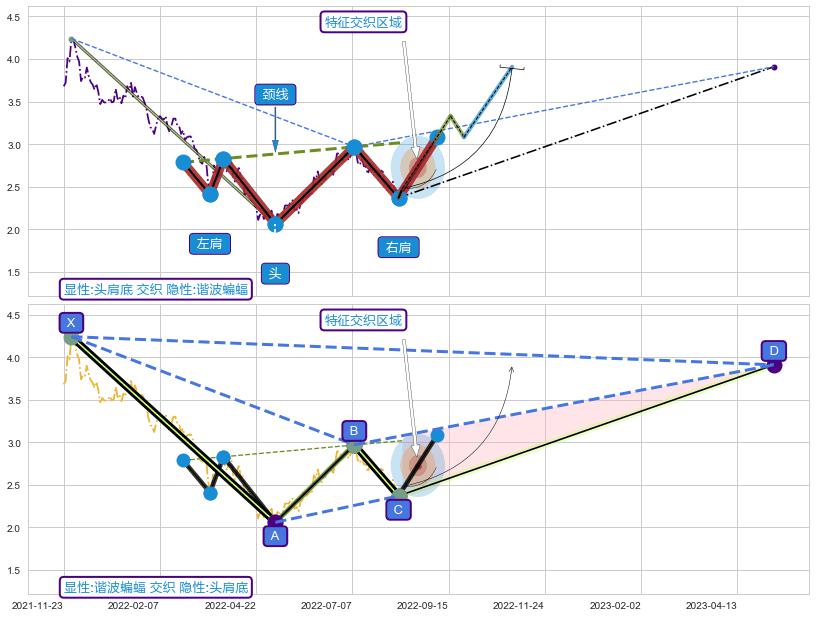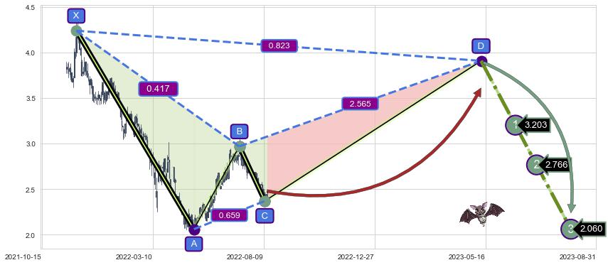 ➣ 未完成【蝙蝠】形态起点X: 2021-11-29, 已到达C点: 2022-08-10, 预测最终D点: 2023-05-10, 共366交易日