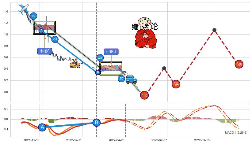 ➣ 缠论中枢点:猜想破位中枢B后持续下拉 → 下跌 → 破位中枢B支撑 → 持续趋势跟踪