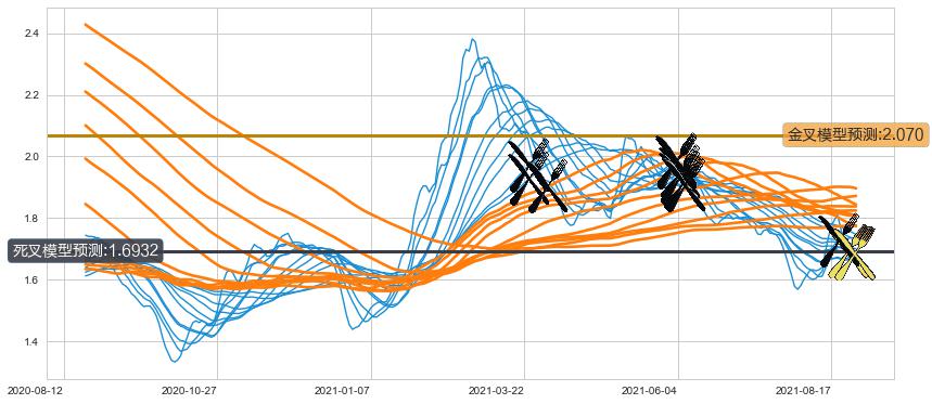 ➢ 60小时均线于(2021-03-23: 1.9238)形成【死叉】基于【死叉历史模型】预测死叉后最低波谷价格: 1.6199, 死叉后最低价格1.5300,已经下跌超出预测最低波谷价格, 预期反弹