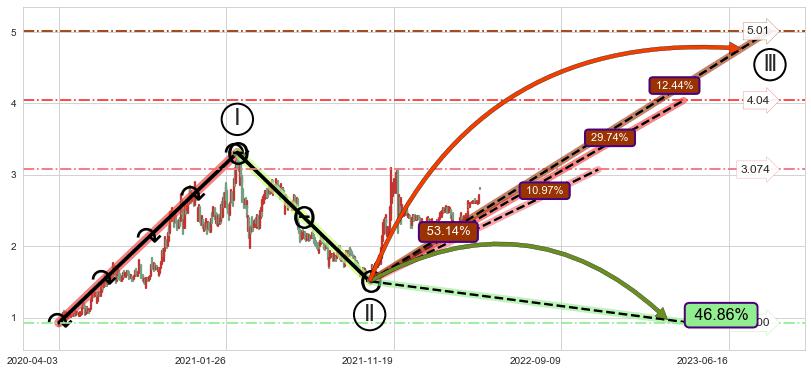 ➣ 循环浪继续向上【平均值】位置(2023-04-03, 4.04),匹配聚类样本比例55.97%, 可能性概率29.74%